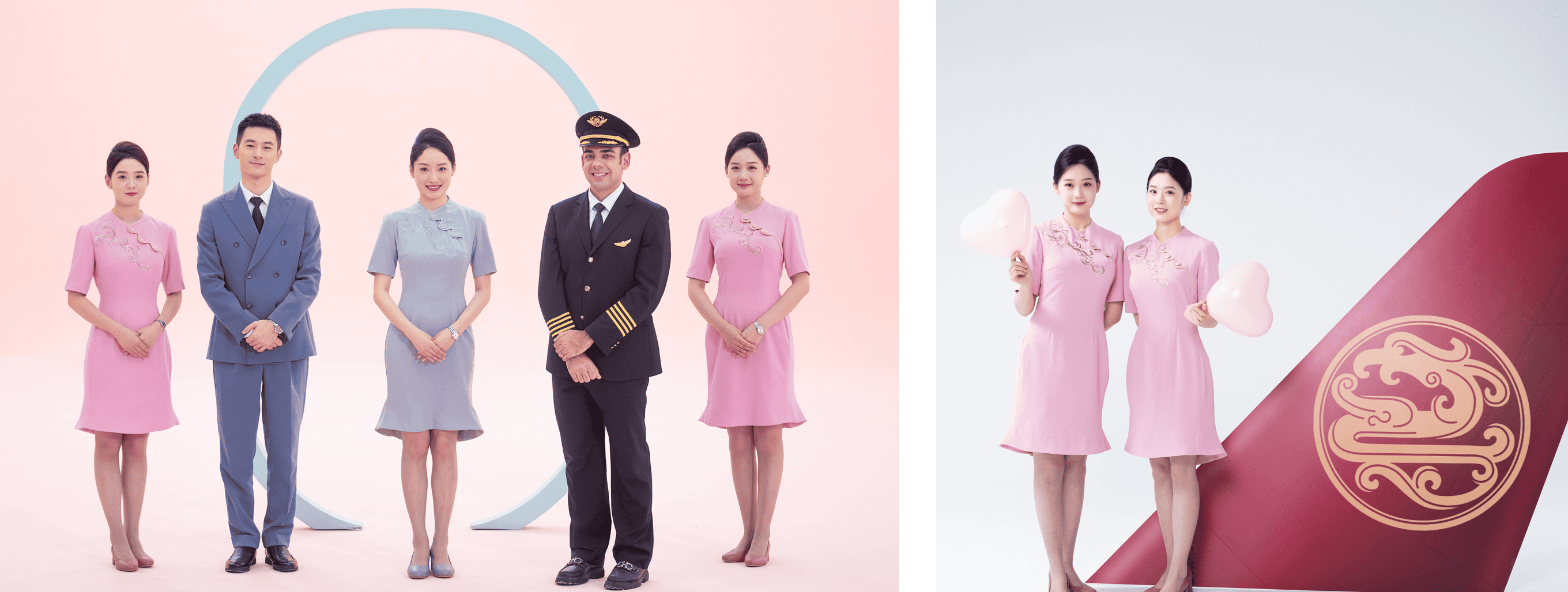 The new uniform of Juneyao Airlines is designed by Ms. Guo Pei, a well-known high-end fashion designer in China. With a low saturation color system as the main color scheme, supplemented by phoenix and peony patterns and gold border embroidery, it conveys the warm, joyful, and caring service concept of Juneyao Airlines, further enhancing the "Dream a Journey; Share a Trip" brand service concept, and strengthening Juneyao Airlines' brand awareness. Women's uniforms are mainly elegant pink with low saturation, while men's uniforms are mainly blue-gray. The two low-contrast color schemes complement each other, reflecting the restrained and composed nature of this great country, while expressing a noble and elegant posture through golden embroidery details.